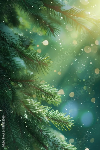 Pine trees adorned with Christmas lights and falling snow in a bright winter day.