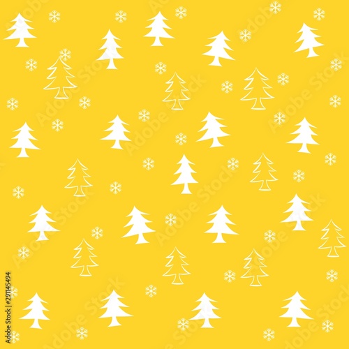 Pine trees and snowflakes seamless background yellow and white colors, winter pattern