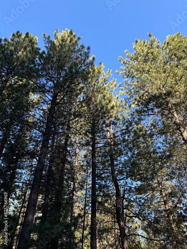 pine trees in a forest beneath a bright blue summer sky - Big Bear, California