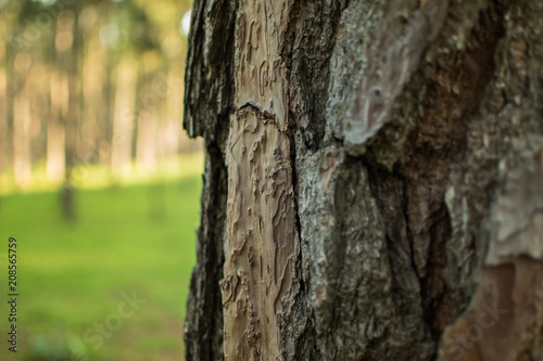 Pine trees in the forest. Bark And the tall corners of tall pines see the sky.