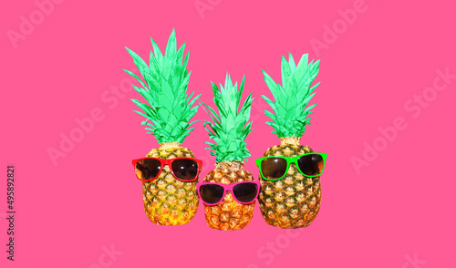 Pineapple with pink sunglasses on pink background, colorful ananas