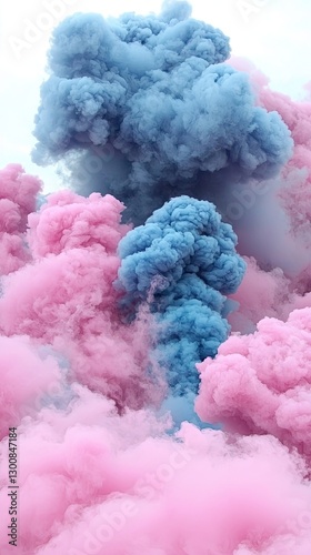 Pink and blue smoke plumes explode outdoors; background is clear sky; ideal for design