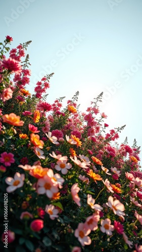 Pink and orange flowers bloom in a garden against a bright blue sky