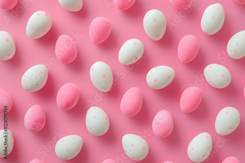 Pink and white candy eggs on a pink background, seamless pattern. Minimal concept,