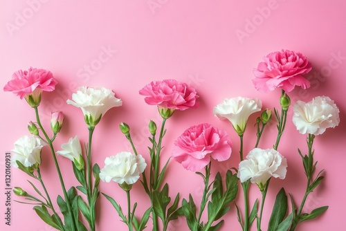 Pink and White Carnations on Pastel Pink Background Minimalistic Floral Composition