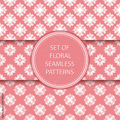 Pink and white floral seamless patterns. Compilation of designs with flowers