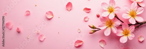 Pink and yellow blossoms scattered on a soft pink background, natural, leaves, blossom
