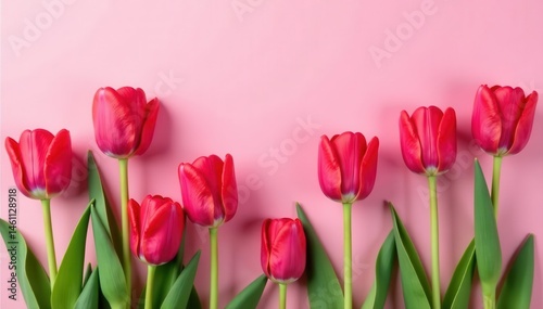 Pink backdrop, vibrant tulips overhead, copy space , colorful, spring flowers, design element