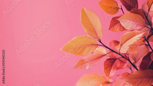 Pink backdrop with coral and orange leaves on a plant branch close-up.