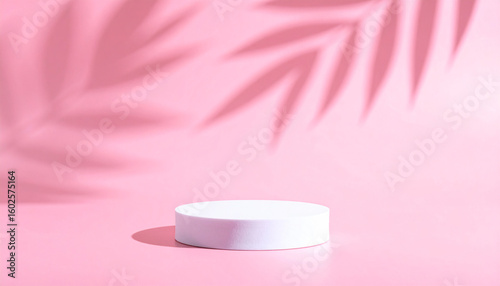Pink background for product presentation with shadow of tropical palm leaves and light. Podium, stage pedestal platform for cosmetic product. Empty round podium. Mockup.