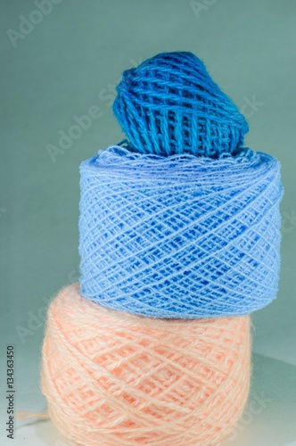 Pink ball of yarn, blue yarn ball and a small ball of blue yarn.