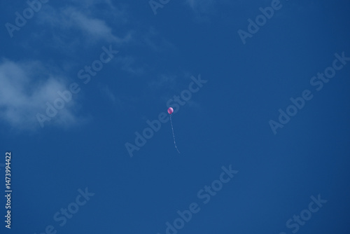 Pink balloon flying in the blue sky with white clouds on a sunny day