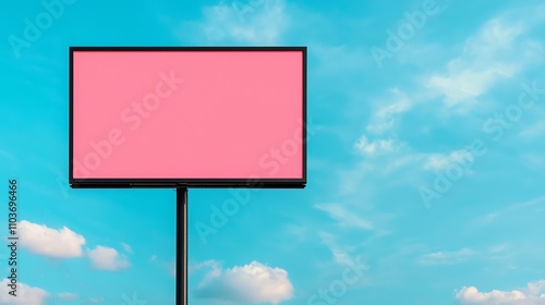 Pink billboard against a vibrant blue sky with fluffy clouds, ideal for advertising and graphic design projects.