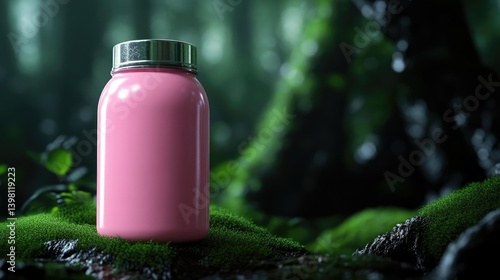 Pink bottle on mossy forest floor. A sleek, pink, cylindrical container sits atop a bed of lush green moss, in a dark, shadowy forest