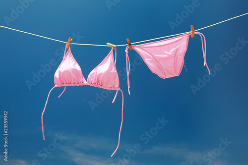 pink bra and panty on clothesline.