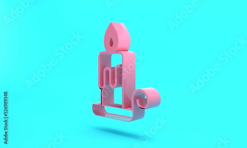 Pink Burning candle in candlestick icon isolated on turquoise blue background. Cylindrical candle stick with burning flame. Minimalism concept. 3D render illustration