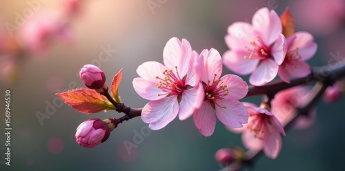Pink cherry blossom branch with scattered buds and leaves, buds, gentle, soft