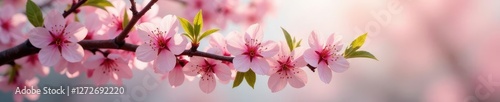 Pink cherry blossom branches with delicate white flowers and green leaves, flora, tree, nature