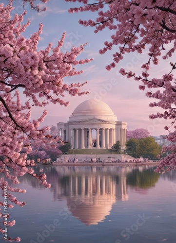 Pink cherry blossoms frame Jefferson Memorial, tourism, building, travel
