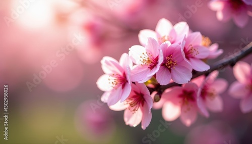 Pink cherry blossoms in full bloom, sunlit petals , pink tree, spring, new life