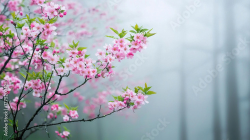 Pink cherry blossoms on branch in misty forest, evoking serenity