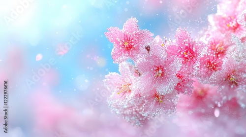 Pink cherry blossoms springtime rain, blurred background, nature scene, greeting card