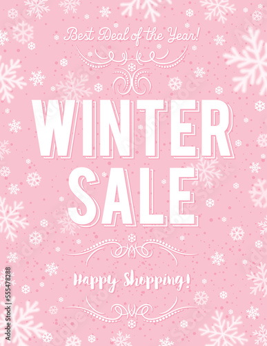 Pink Christmas sale poster with snowflakes, vector illustration