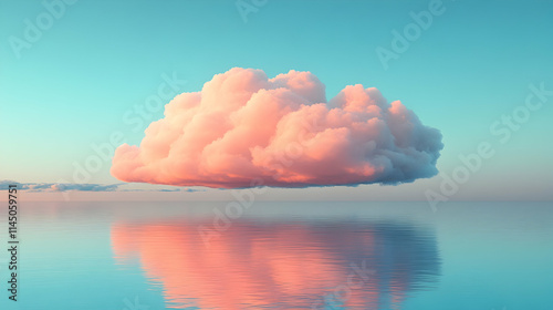 Pink cloud reflected in calm water at sunset.