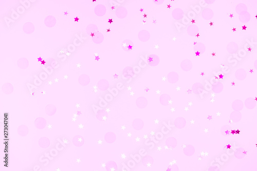 Pink confetti and stars and sparkles on pink background. Top view, flat lay. Copyspace for text. Bright and festive holiday background. For Christmas, New year, Mother's day.