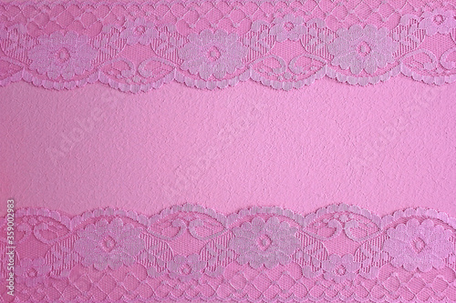 Pink contour background of pink lilac lace, guipure contour along the edges of the format and free space for text and creative designer's inscription. Design text
