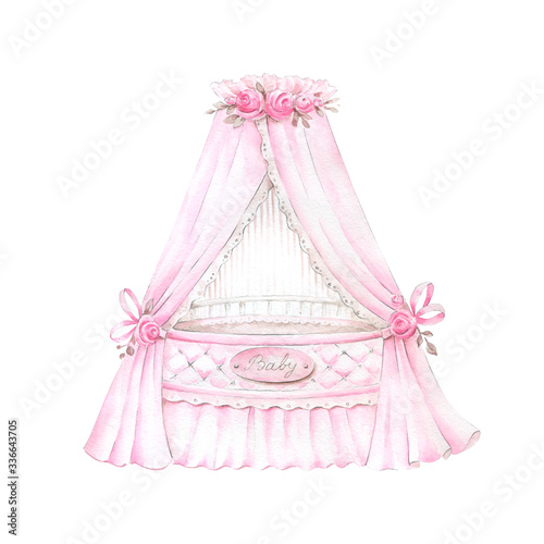 Pink cradle for baby girl.Watercolor hand drawn illustrations isolated on white background.
