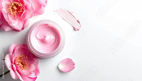 Pink cream jar with roses on white background