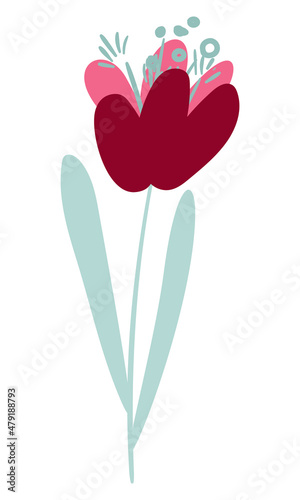 Pink crocus in naive style with blue stem and leaves