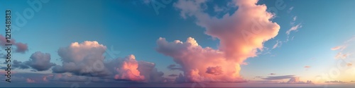 Pink cumulus clouds fill vast sunset sky. Bright sunlight paints clouds in vibrant hues. Panoramic aerial view. Seamless sky background. Perfect for sky replacement on drone footage. Stunning