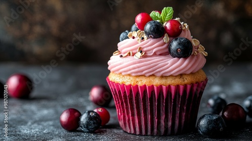Pink Cupcake Topped with Fresh Berries and Oats