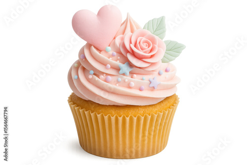 Pink cupcake with frosting, heart and rose decoration isolated on transparent background, perfect for valentine's day or birthdays