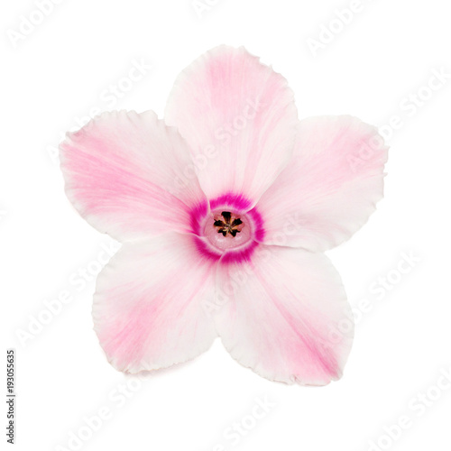Pink cyclamen flower isolated on white background. Shape of starfish and eyes. Summer. Spring. Flat lay, top view. Love. Valentine's Day.