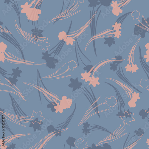 Pink daffodils on blue background seamless pattern