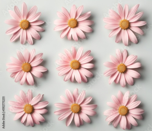 Pink daisies arranged asymmetrically on a soft background, creating a minimalist and modern aesthetic.