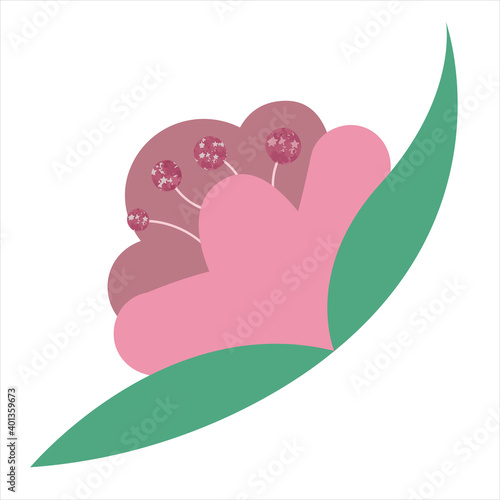 pink decorative flower with shiny stamens and green leaves, vector element,