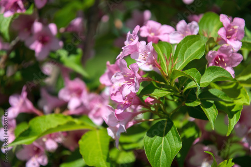 Pink delicate weigela flowers in the spring garden