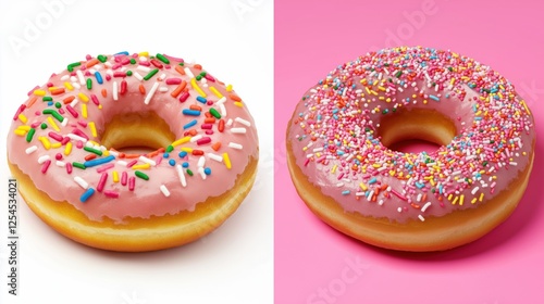 pink donut on a pink background. The donut is round and has a hole in the center. It is covered in colorful sprinkles in various colors, including red, blue, green, yellow, and pink.