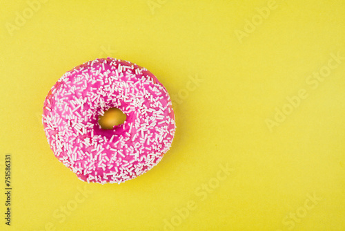 Pink donut on color background, flat lay, top view