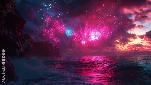 Pink fireworks over ocean cliffs at sunset, dramatic sky, fantasy