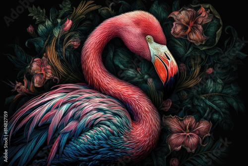 Pink Flamingo and tropical flowers on a black background. Flamingo bird in tropical garden, closeup. Flamingo art wallpaper