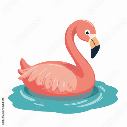 Pink flamingo Phoenicopterus roseus floats on water. Pink bird with elegant curved neck and long legs rests in calm blue water.