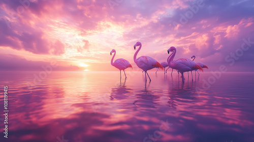 Pink flamingos stand in a calm, pink sunset reflecting water