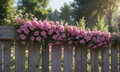 Pink floral banner draped across a wooden fence post, fence, wood, decor