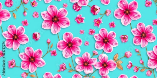 Pink floral seamless pattern, blue background, worm's-eye view, print, ornament
