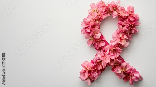 Pink Flower Awareness Ribbon On White Background, Symbol Of Hope Support, Healthcare Concept